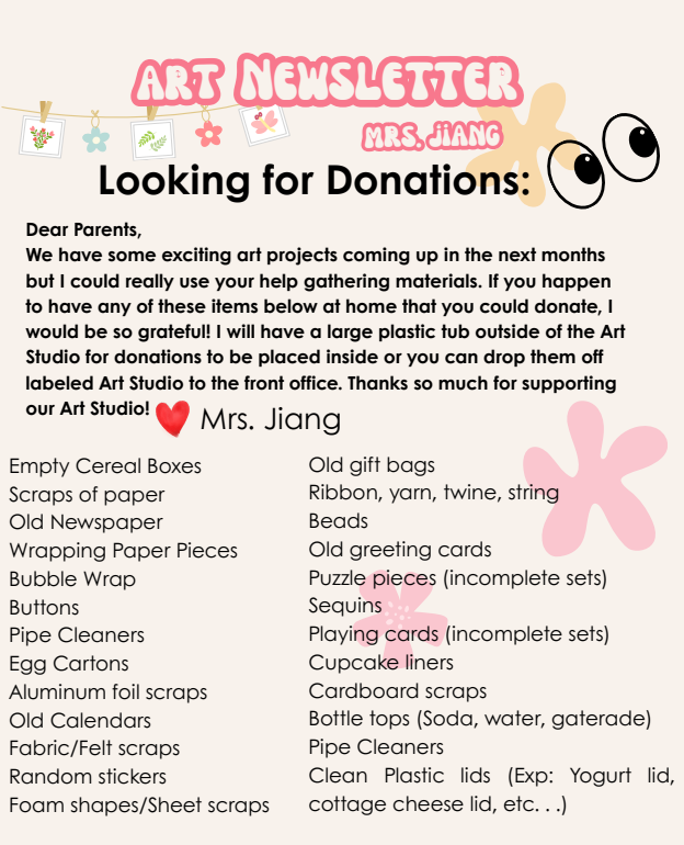 Our wonderful and talented Art Teacher, Mrs. Jiang, is needing our help with donations! If you can send in any donations that she is requesting with your child to drop off in the bin outside of the Art Studio, or if you can bring in donations labeled Art Studio and drop it to the front office staff so it can get to her, it would be greatly appreciated. Let’s fill the Art Room with all the supplies needed so we can see our kids’ beautiful artwork brighten up the school and our homes!